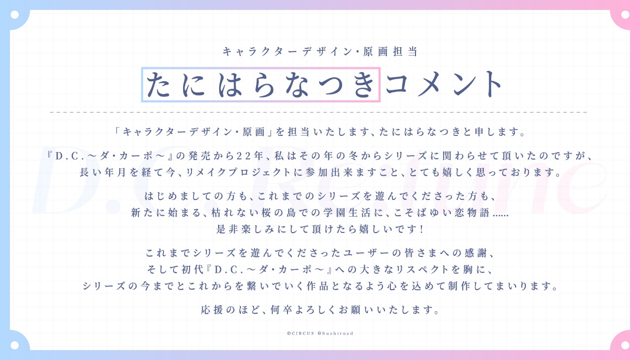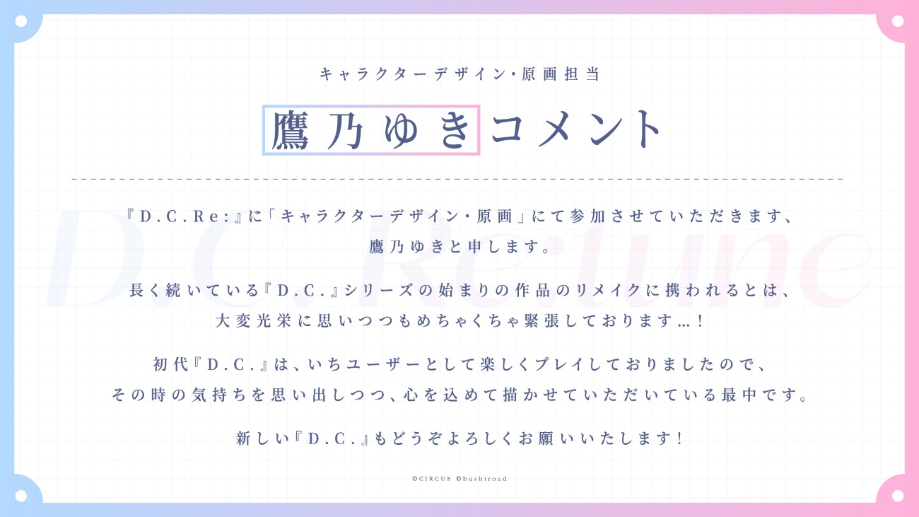 『D.C.Re:』に「キャラクターデザイン・原画」にて参加させていただきます、鷹乃ゆきと申します。